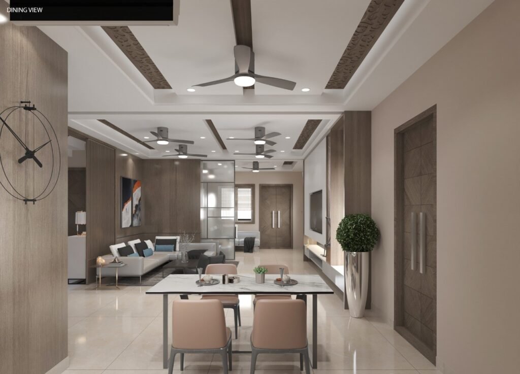 Each bedroom is a sanctuary crafted with individual personality—be it the serene master suite with luxurious upholstered finishes, the playful yet poised kid’s room with pastel detailing, or the integrated study spaces that blend into the overall design without visual clutter. Smart lighting features, including recessed cove lighting and ambient downlights, elevate the aesthetic while maintaining a soft, calming vibe across the villa. In the formal areas, intricate ceiling designs with carved wooden inlays and minimalist wall art lend a distinct character without overpowering the simplicity of the surroundings. The dining space, nestled elegantly beside the living area, carries forward the material story with marble tabletops and muted upholstery, highlighting a design narrative rooted in practicality and warmth.