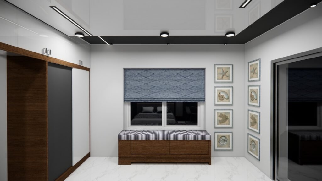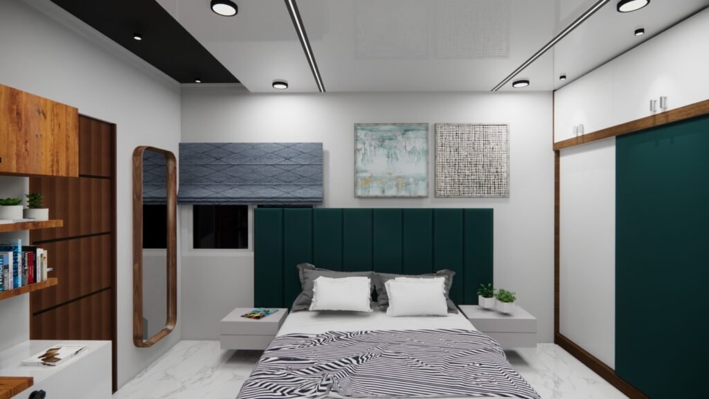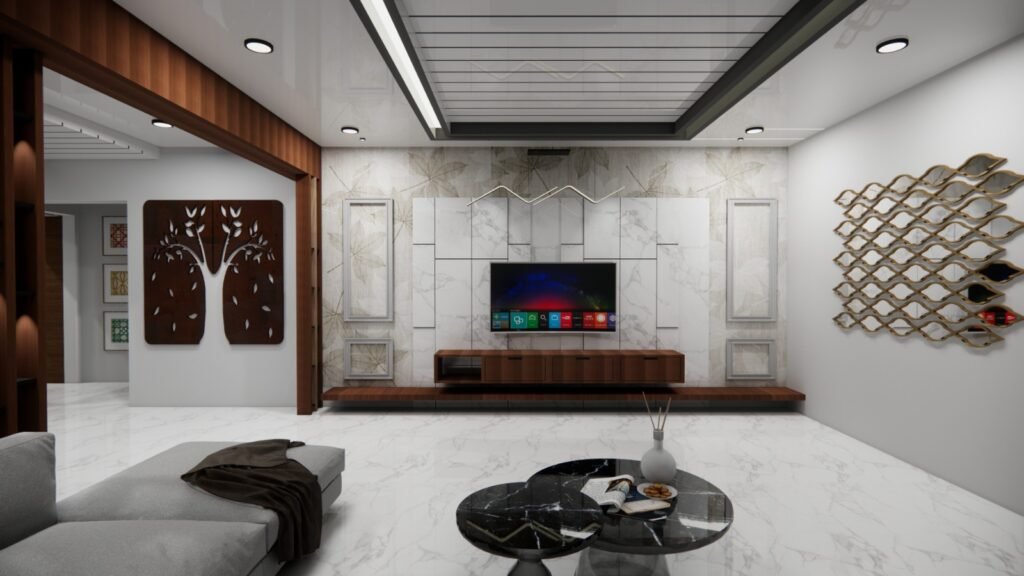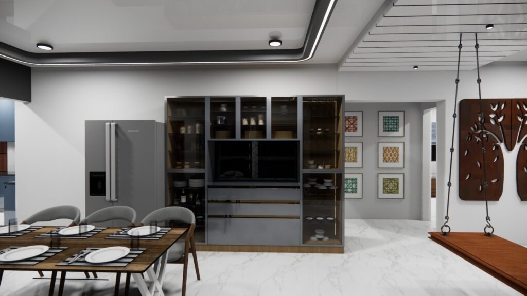 The interiors are tied together with strong geometric patterns—seen across ceiling panel designs, wall arts, and partition screens—bringing a consistent visual rhythm to the home. Green elements, natural textures, and subtle accent materials ensure that every corner of the house feels alive, fresh, and rooted in nature. The Srinivas Reddy 3BHK flat stands as a testament to refined living — where every square foot reflects thoughtful curation, enduring materiality, and a vision for timeless, peaceful living.